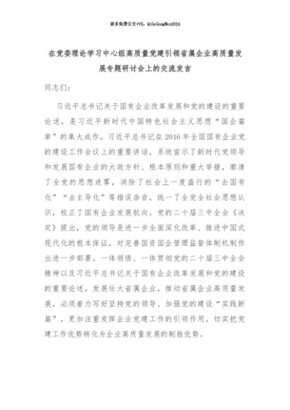 【七哥公文】2024年:在党委理论学习中心组高质量党建引领省属企业高质量发展专题研讨会上的交流发言+更多免费公文+VX:QiGeGongWen2024