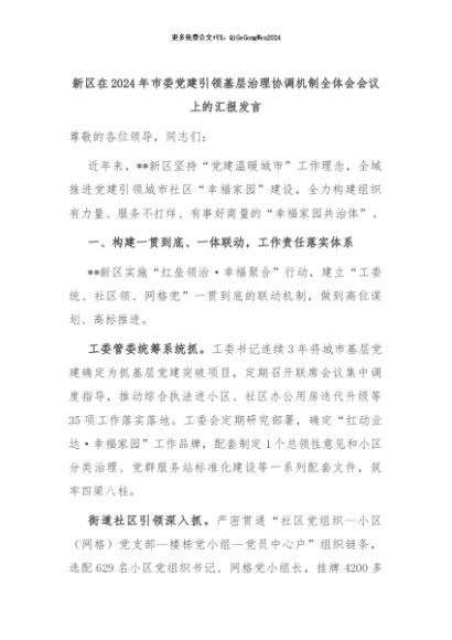 【七哥公文】2024年:新区在2024年市委党建引领基层治理协调机制全体会会议上的汇报发言+更多免费公文+VX:QiGeGongWen2024