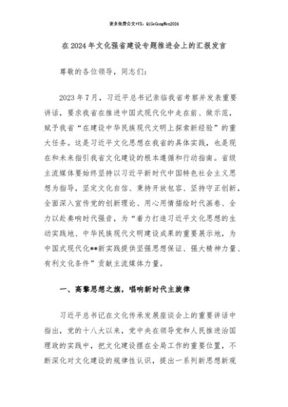 / 【七哥公文】2024年:在2024年文化强省建设专题推进会上的汇报发言+更多免费公文+VX:QiGeGongWen2024