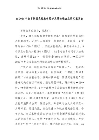 【七哥公文】2024年:在2024年全市新型农村集体经济发展推进会上的汇报发言+更多免费公文+VX:QiGeGongWen2024