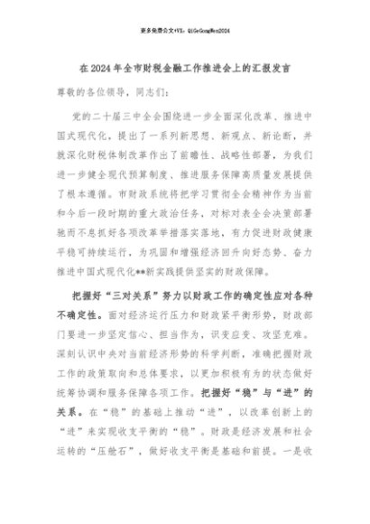 / 【七哥公文】2024年:在2024年全市财税金融工作推进会上的汇报发言+更多免费公文+VX:QiGeGongWen2024