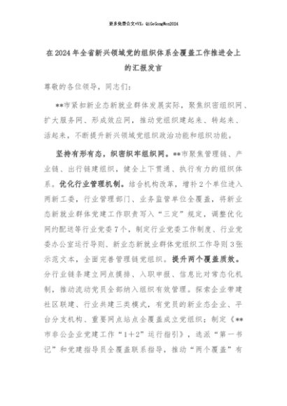 【七哥公文】2024年:在2024年全省新兴领域党的组织体系全覆盖工作推进会上的汇报发言+更多免费公文+VX:QiGeGongWen2024