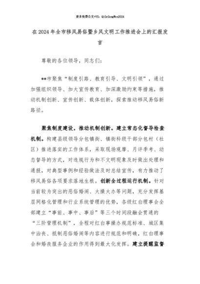 【七哥公文】2024年:在2024年全市移风易俗暨乡风文明工作推进会上的汇报发言+更多免费公文+VX:QiGeGongWen2024