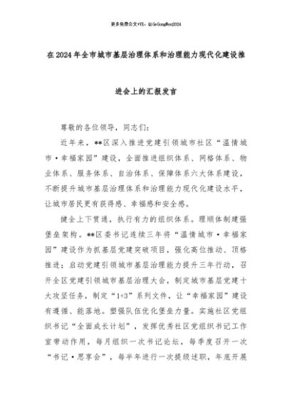 【七哥公文】2024年:在2024年全市城市基层治理体系和治理能力现代化建设推进会上的汇报发言+更多免费公文+VX:QiGeGongWen2024