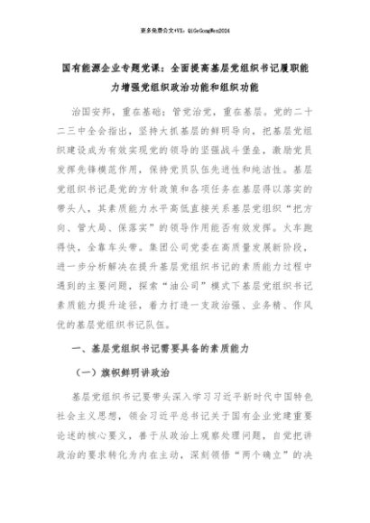 【七哥公文】2024年:国有能源企业专题党课:全面提高基层党组织书记履职能力增强党组织政治功能和组织功能+更多免费公文+VX:QiGeGongWen2024