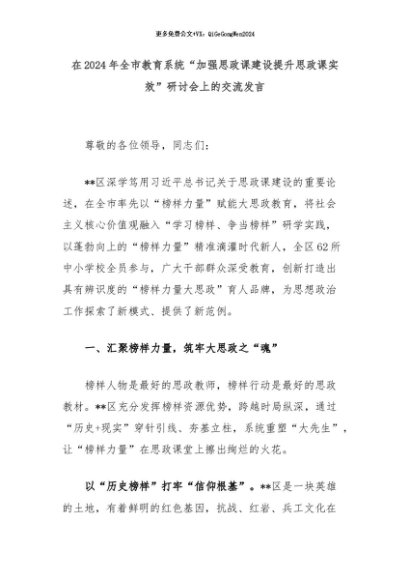 【七哥公文】2024年:在2024年全市教育系统“加强思政课建设提升思政课实效”研讨会上的交流发言+更多免费公文+VX:QiGeGongWen2024