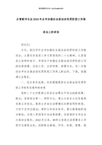 【七哥公文】2024年:分管副市长在2024年全市加强社会面治安巡逻防控工作推进会上的讲话+更多免费公文+VX:QiGeGongWen2024
