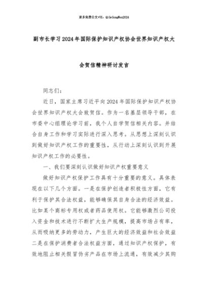 【七哥公文】2024年:副市长学习2024年国际保护知识产权协会世界知识产权大会贺信精神研讨发言+更多免费公文+VX:QiGeGongWen2024
