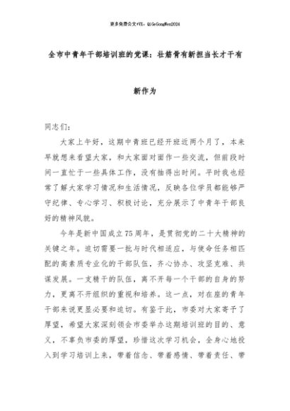 【七哥公文】2024年:全市中青年干部培训班的党课:壮筋骨有新担当长才干有新作为+更多免费公文+VX:QiGeGongWen2024