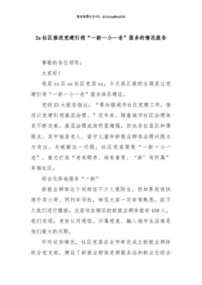 【七哥公文】2024年:Xx社区推进党建引领“一新一小一老”服务的情况报告+更多免费公文+VX:QiGeGongWen2024