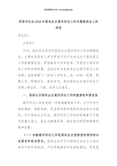 【七哥公文】2024年:党委书记在2024年国有企业意识形态工作专题推进会上的讲话+更多免费公文+VX:QiGeGongWen2024