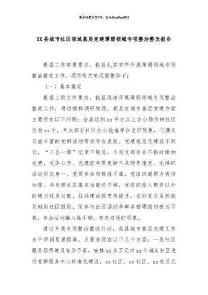 【七哥公文】2024年:XX县城市社区领域基层党建薄弱领域专项整治整改报告+更多免费公文+VX:QiGeGongWen2024