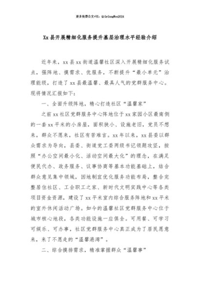 【七哥公文】2024年:Xx县开展精细化服务提升基层治理水平经验介绍+更多免费公文+VX:QiGeGongWen2024