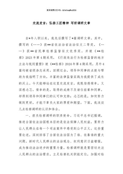 / 【七哥公文】2024年:交流发言:弘扬工匠精神 写好调研文章+更多免费公文+VX:QiGeGongWen2024