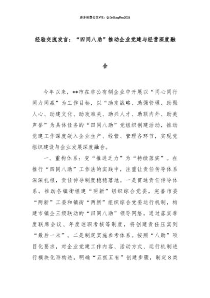 【七哥公文】2024年:经验交流发言:“四同八助”推动企业党建与经营深度融合+更多免费公文+VX:QiGeGongWen2024