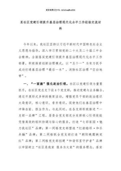 【七哥公文】2024年:某社区党建引领提升基层治理现代化水平工作经验交流材料+更多免费公文+VX:QiGeGongWen2024