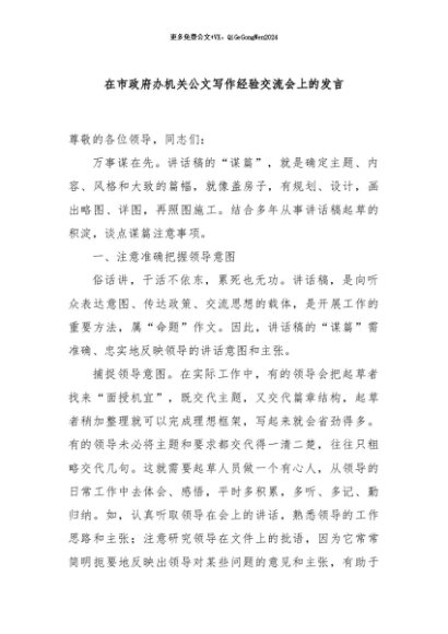 / 【七哥公文】2024年:在市政府办机关公文写作经验交流会上的发言+更多免费公文+VX:QiGeGongWen2024