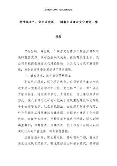 【七哥公文】2024年:扬清风正气,促企业发展——国有企业廉洁文化建设工作总结+更多免费公文+VX:QiGeGongWen2024
