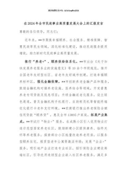 【七哥公文】2024年:在2024年全市民政事业高质量发展大会上的汇报发言+更多免费公文+VX:QiGeGongWen2024