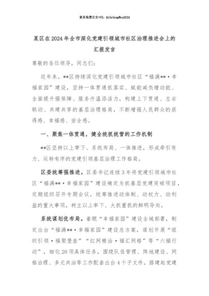 【七哥公文】2024年:某区在2024年全市深化党建引领城市社区治理推进会上的汇报发言+更多免费公文+VX:QiGeGongWen2024