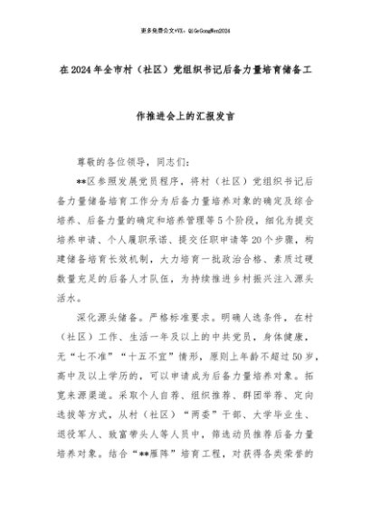 【七哥公文】2024年:在2024年全市村(社区)党组织书记后备力量培育储备工作推进会上的汇报发言+更多免费公文+VX:QiGeGongWen2024