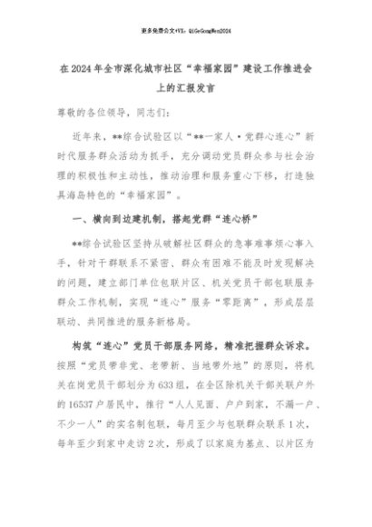 【七哥公文】2024年:在2024年全市深化城市社区“幸福家园”建设工作推进会上的汇报发言+更多免费公文+VX:QiGeGongWen2024