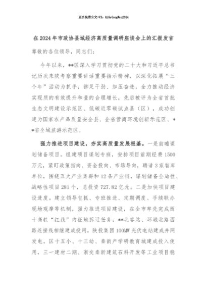 【七哥公文】2024年:在2024年市政协县域经济高质量调研座谈会上的汇报发言+更多免费公文+VX:QiGeGongWen2024