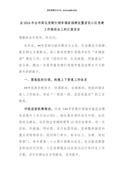 【七哥公文】2024年:在2024年全市深化党建引领幸福家园建设暨居民小区党建工作推进会上的汇报发言+更多免费公文+VX:QiGeGongWen2024