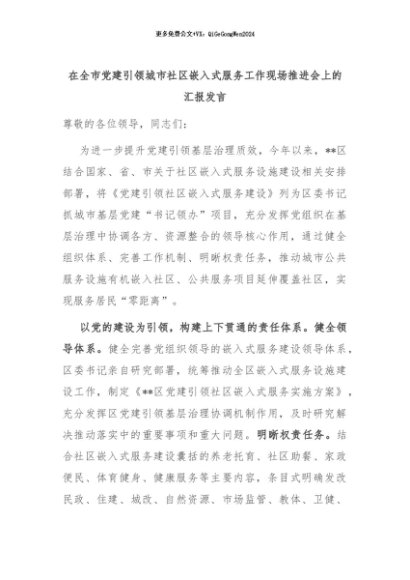 【七哥公文】2024年:在全市党建引领城市社区嵌入式服务工作现场推进会上的汇报发言+更多免费公文+VX:QiGeGongWen2024