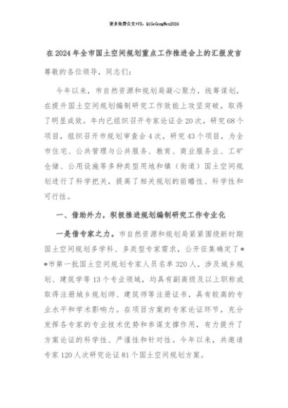 【七哥公文】2024年:在2024年全市国土空间规划重点工作推进会上的汇报发言+更多免费公文+VX:QiGeGongWen2024
