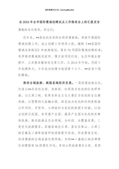 【七哥公文】2024年:在2024年全市国际慢城创建试点工作推进会上的汇报发言+更多免费公文+VX:QiGeGongWen2024