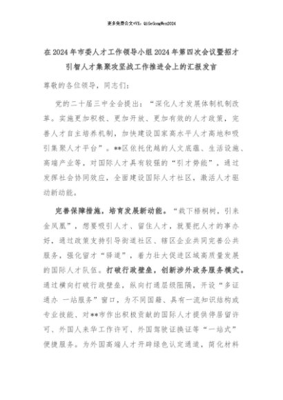 【七哥公文】2024年:在2024年市委人才工作领导小组2024年第四次会议暨招才引智人才集聚攻坚战工作推进会上的汇报发言+更多免费公文+VX:QiGeGongWen2024