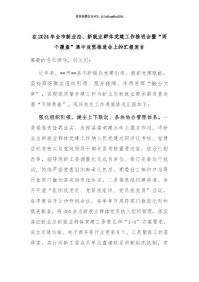 【七哥公文】2024年:在2024年全市新业态、新就业群体党建工作推进会暨“两个覆盖”集中攻坚推进会上的汇报发言+更多免费公文+VX:QiGeGongWen2024