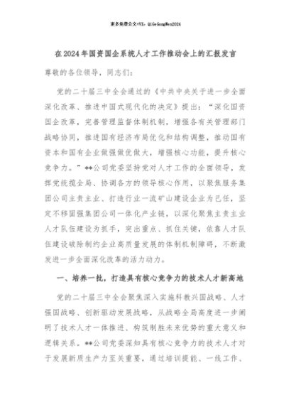 【七哥公文】2024年:在2024年国资国企系统人才工作推动会上的汇报发言+更多免费公文+VX:QiGeGongWen2024