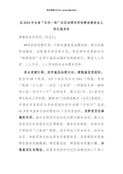 【七哥公文】2024年:在2024年全省“五位一体”社区治理共同体建设推进会上的汇报发言+更多免费公文+VX:QiGeGongWen2024