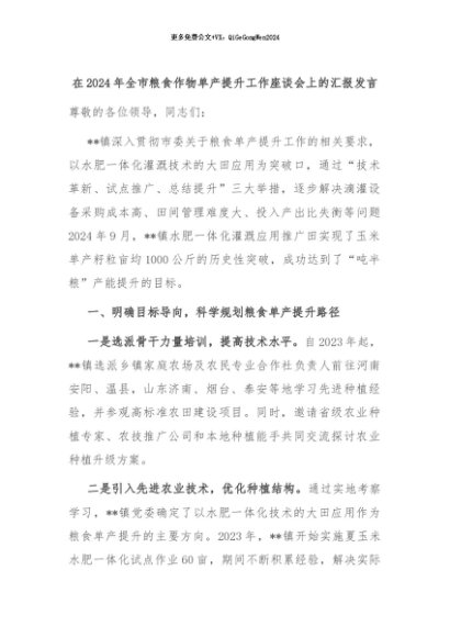 【七哥公文】2024年:在2024年全市粮食作物单产提升工作座谈会上的汇报发言+更多免费公文+VX:QiGeGongWen2024