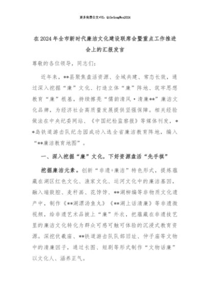 【七哥公文】2024年:在2024年全市新时代廉洁文化建设联席会暨重点工作推进会上的汇报发言+更多免费公文+VX:QiGeGongWen2024