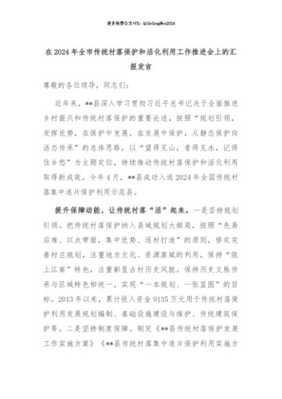 【七哥公文】2024年:在2024年全市传统村落保护和活化利用工作推进会上的汇报发言+更多免费公文+VX:QiGeGongWen2024