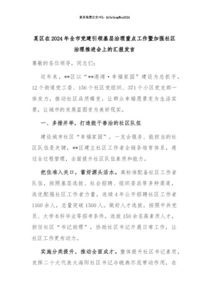 【七哥公文】2024年:某区在2024年全市党建引领基层治理重点工作暨加强社区治理推进会上的汇报发言+更多免费公文+VX:QiGeGongWen2024