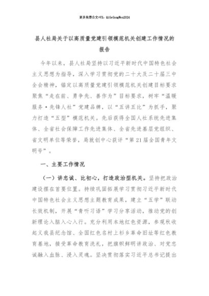 【七哥公文】2024年:县人社局关于以高质量党建引领模范机关创建工作情况的报告+更多免费公文+VX:QiGeGongWen2024