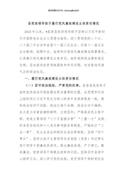/ 【七哥公文】2024年:县党政领导班子履行党风廉政建设主体责任情况+更多免费公文+VX:QiGeGongWen2024