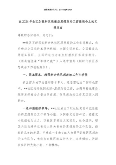 【七哥公文】2024年:在2024年全区加强和改进基层思想政治工作推进会上的汇报发言+更多免费公文+VX:QiGeGongWen2024