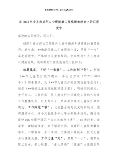 【七哥公文】2024年:在2024年全县未成年人心理健康工作现场推进会上的汇报发言+更多免费公文+VX:QiGeGongWen2024