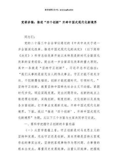 / 【七哥公文】2024年:党课讲稿:推进“四个创新”开辟中国式现代化新境界+更多免费公文+VX:QiGeGongWen2024