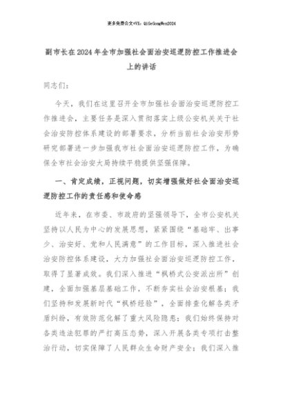 【七哥公文】2024年:副市长在2024年全市加强社会面治安巡逻防控工作推进会上的讲话+更多免费公文+VX:QiGeGongWen2024