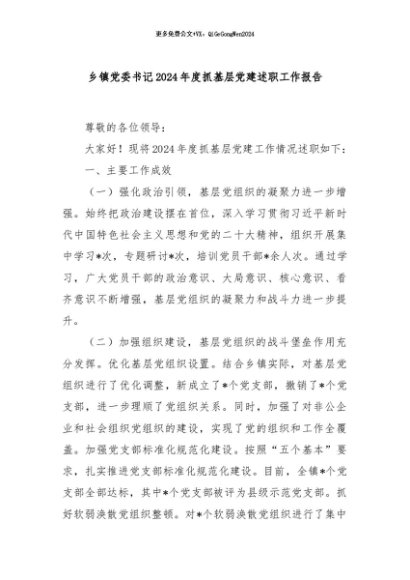 / 【七哥公文】2024年:乡镇党委书记2024年度抓基层党建述职工作报告+更多免费公文+VX:QiGeGongWen2024