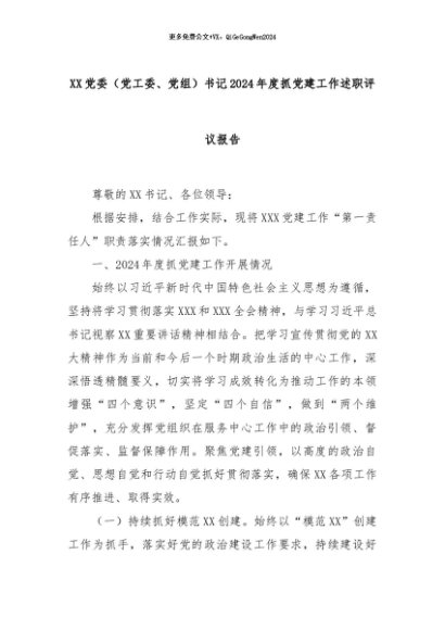【七哥公文】2024年:XX党委(党工委、党组)书记2024年度抓党建工作述职评议报告+更多免费公文+VX:QiGeGongWen2024