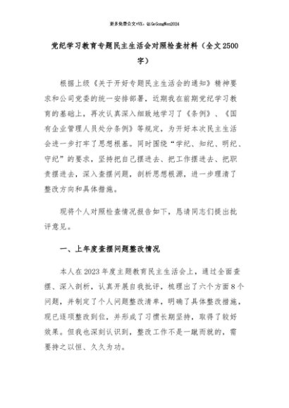 【七哥公文】2024年:XX党委班子成员党纪学习教育专题民主生活会对照检查材料+更多免费公文+VX:QiGeGongWen2024