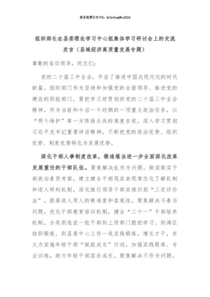 【七哥公文】2024年:组织部长在县委理论学习中心组集体学习研讨会上的交流发言(县域经济高质量发展专题)+更多免费公文+VX:QiGeGongWen2024