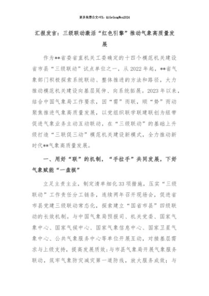 【七哥公文】2024年:汇报发言:三级联动激活“红色引擎”推动气象高质量发展+更多免费公文+VX:QiGeGongWen2024